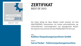 Unter den über 1.200 eingereichten Produkten konnte die vollautomatische Folienverpackungsmaschine, der Kallfass Servo Packer, die Experten-Jury des Industriepreises 2013 überzeugen. Der Huber Verlag für Neue Medien und die Initiative Mittelstand, die seit 2006 diesen Preis vergeben, zeichneten die Verpackungsmaschine und das dahinter stehende Konzept aus. In der Kategorie „Produktionstechnik und Maschinenbau“ wurde Kallfass Verpackungsmaschinen das Zertifikat „BEST OF 2013“ verliehen.